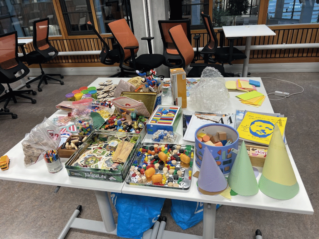 Select a challenge you experience in (interdisciplinary) collaboration (or in your work more generally), start building a metaphorical expression of the challenge, let yourself be surprised by the process of building and use of different materials. Then, connect each individual material metaphor with the metaphors of your group members.