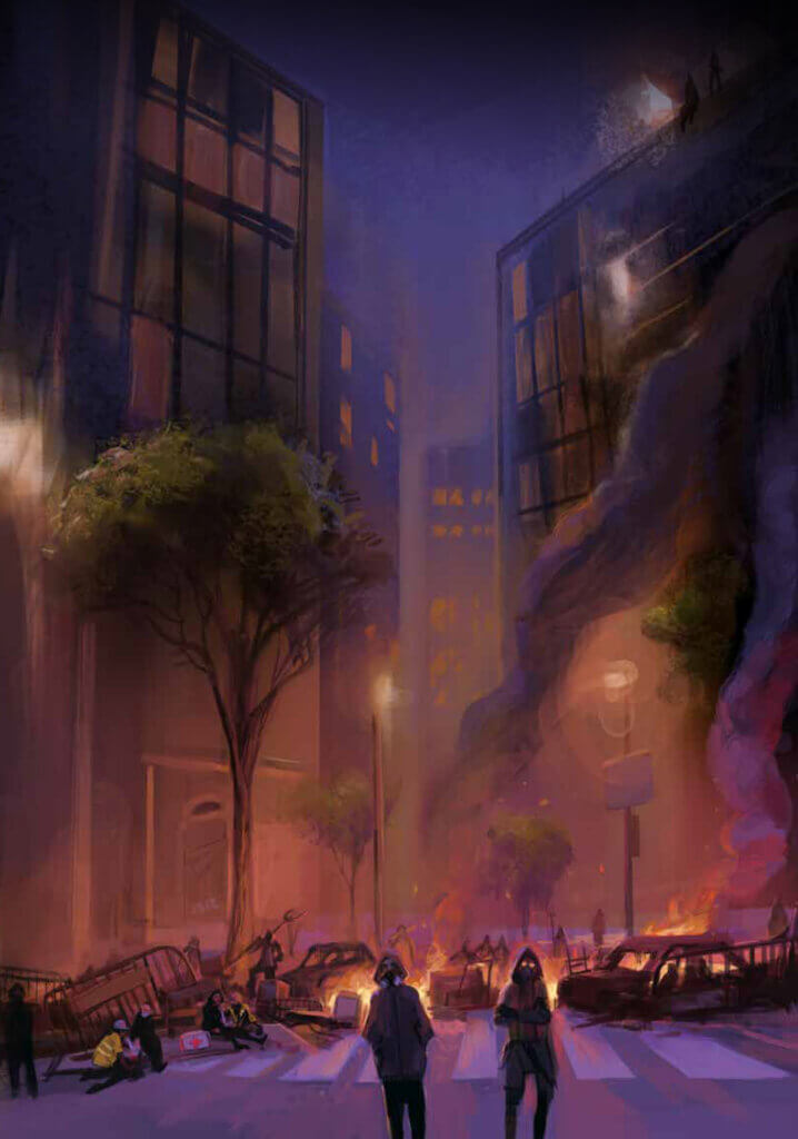 Night at the Barricades was created by Kyle Thompson, Joost Vervoort, and Lauren McManamon, with layout by Vee Hendro and illustrations by Cory McDaniel and Enora Mercier.