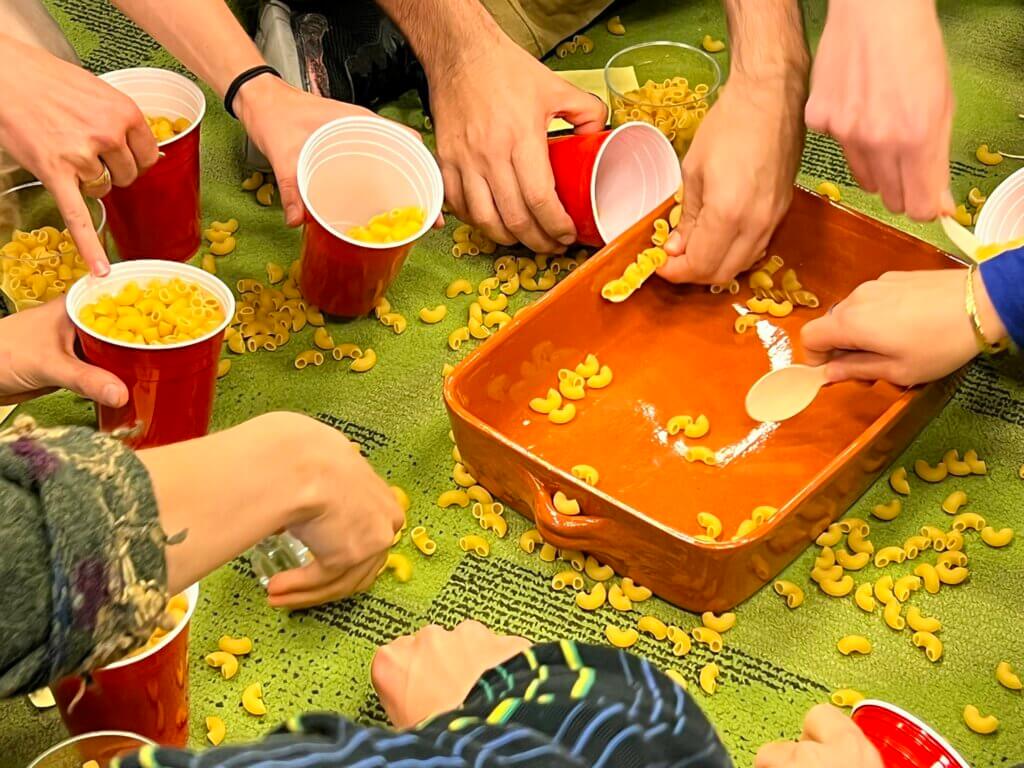 - Position all players (either on chairs or standing) around the central tub of macaroni