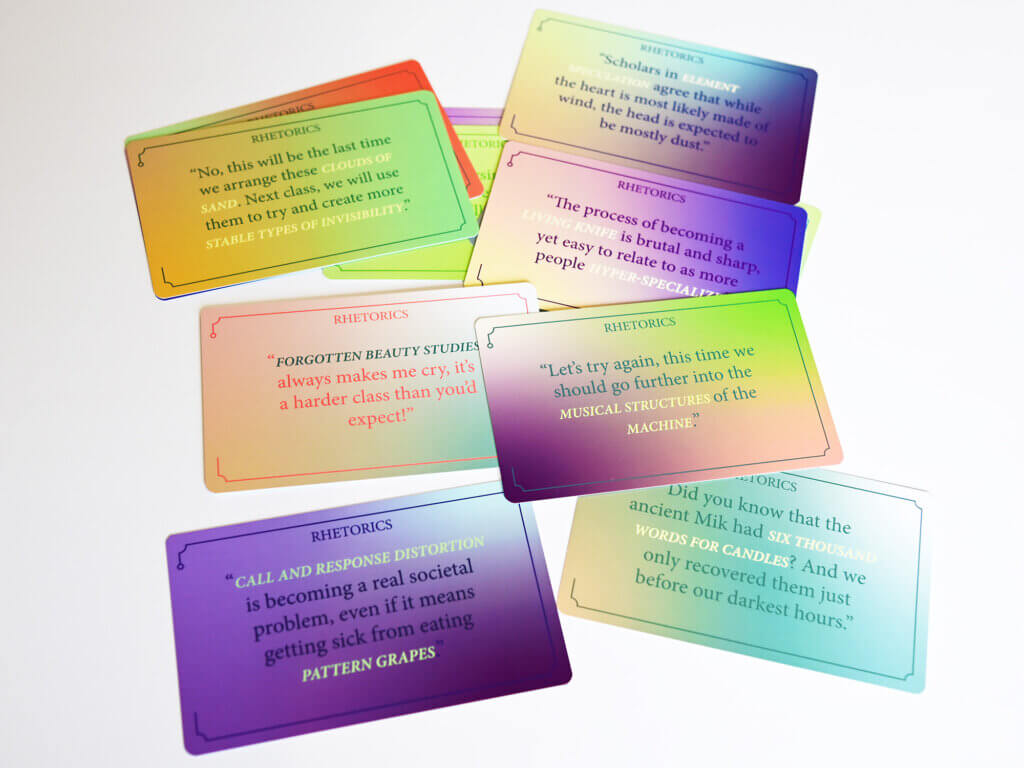- Draw a Rhetoric card and place it face-up. Together, complete the world by integrating some meaning from this Rhetoric (~3 minutes). Do any new ideas arise from the combination of these cards?