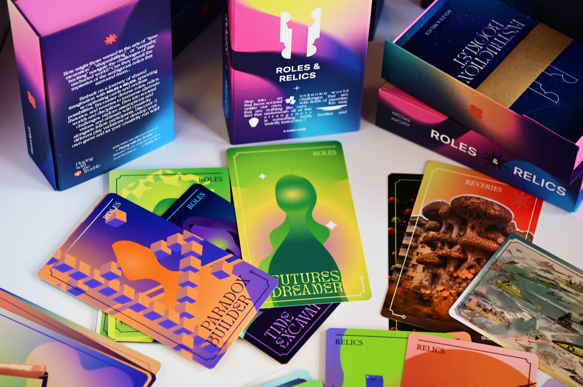 In this version of Roles and Relics you use prompt cards to collectively imagine a new world, including the most pressing problem it faces. You assume individual roles and make use of relics to address this problem.