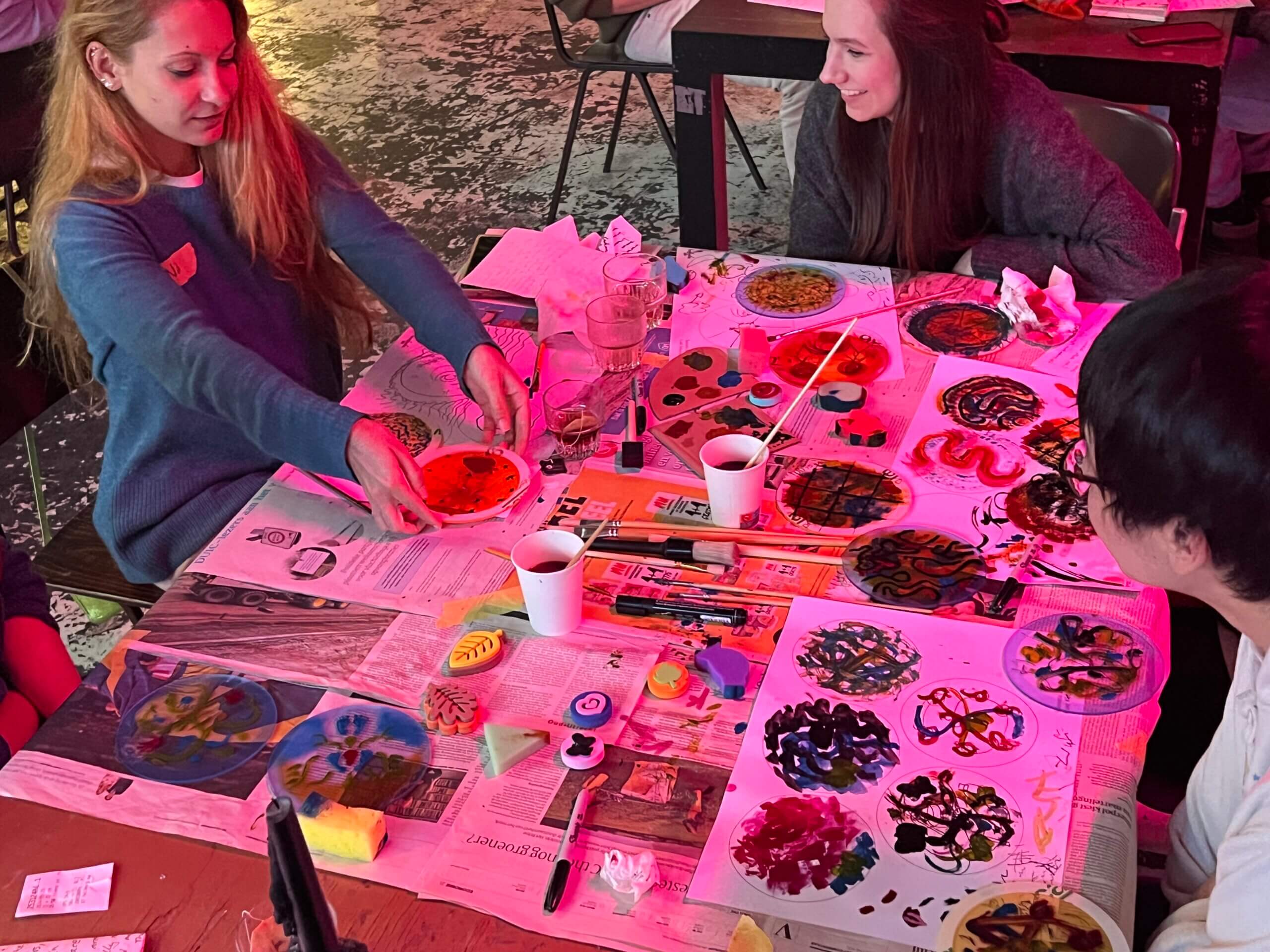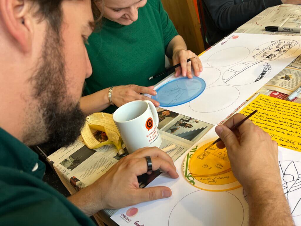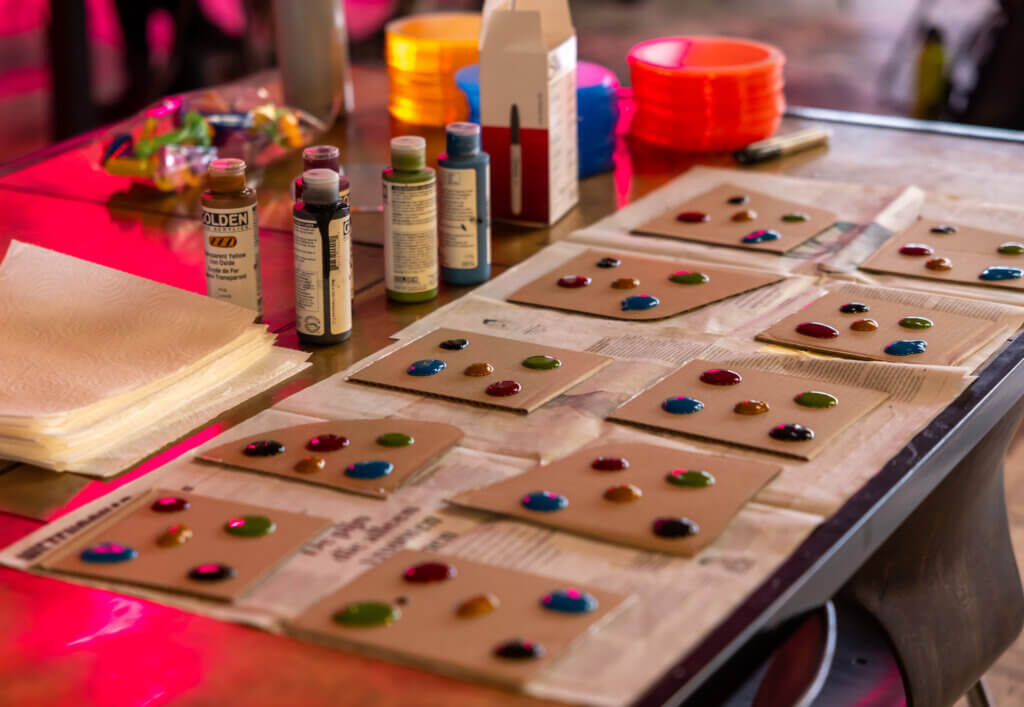 A table set up for 8 participants. Usually we would recommend a smaller group (3–5 people per table). The pink cards are part of the icebreaker exercise. | Setup & introduction (20 mins) Groups of 3–5 participants each sit at newspaper-covered tables, with some pens, blank paper, and the template sheets. A separate central table has paint, more pens, paintbrushes and foam shapes of various kinds, and the acrylic discs. An icebreaker or bonding exercise helps participants get to know the others at their tables, ideally with more values-based or deeper existential questions which stimulate conversation with each other beyond people’s occupations and reasons for participation. See Falling in Love: A Warm-Up. |