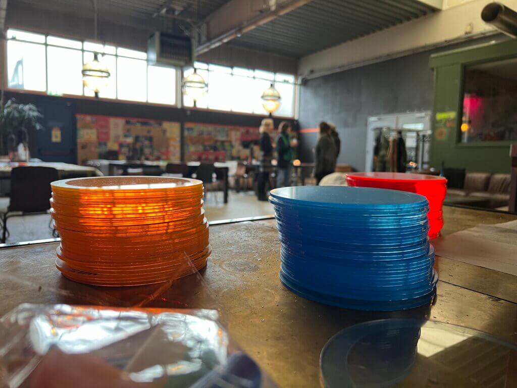 Paint palettes made from pieces of cardboard with five blobs of acrylic paint on them (photo by Paula Angelica); and the yellow, orange, and clear discs stacked before a workshop.