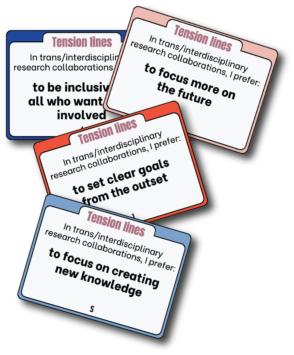In inter- and transdisciplinary collaborations we usually experience tensions due to fundamentally different values, perspectives, assumptions orand research methods (in research context). This is not wrong, but needs to be anticipated and navigated. This game helps to explore and make visible different perspectives on how we collaborate.